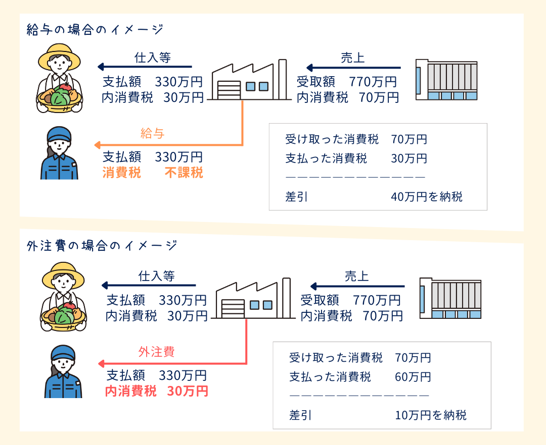 - 同じ金額を支払う場合、給与よりも外注費のほうが、消費税負担は軽減できる。